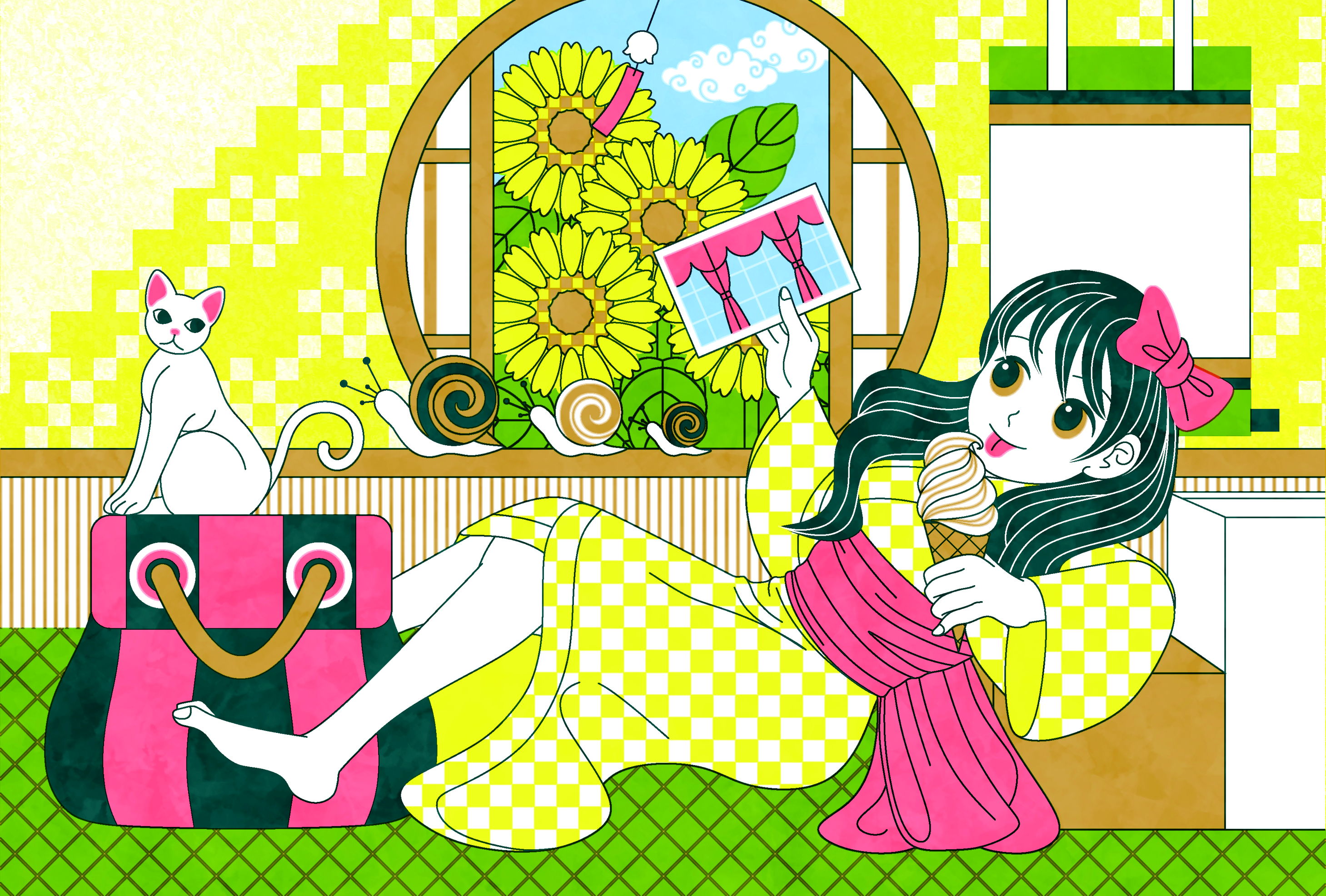 サマーカードテンプレート 和風少女と猫 暑中見舞い 残暑見舞い 引越し挨拶状 転居通知等 むしとりねこ Awrd アワード