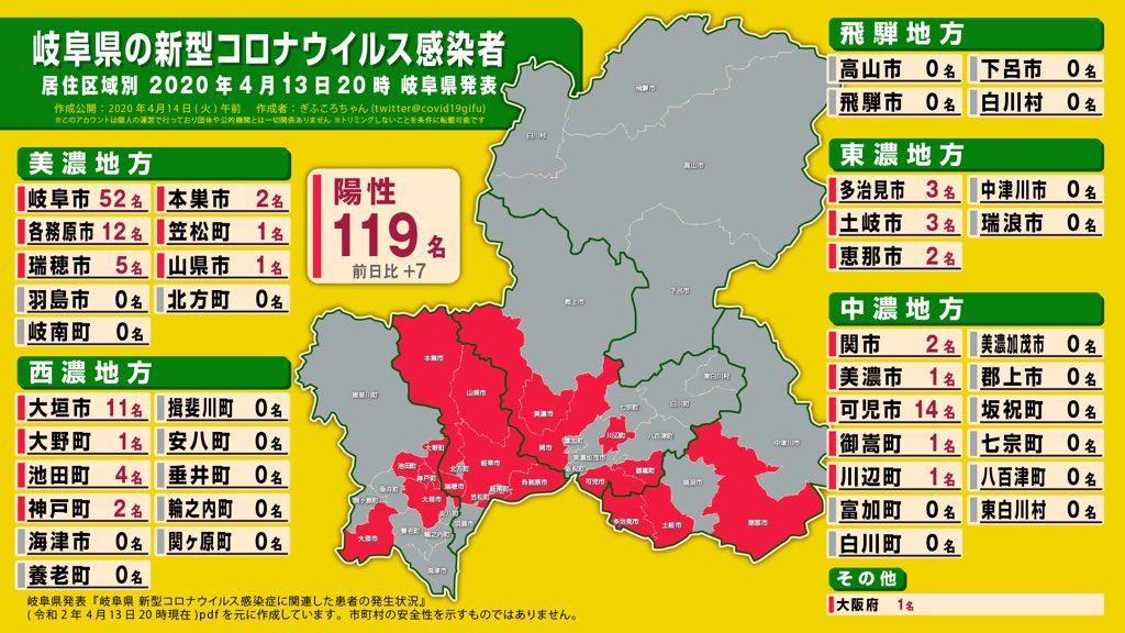 ぎふころちゃん Auf Twitter 岐阜県が令和2年4月13日に発表した新型コロナウイルスの陽性患者 119名 の居住市町村を地図でまとめました 安全性を示すものではありません 新たに赤色になった地域はありません 感染者増加地域は岐阜市 瑞穂市 大垣市 各務原市